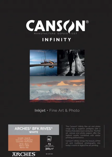 ARCHES® BFK Rives® White est un prestigieux papier d'impression d'art qui offre aux photographes, aux artistes et aux imprimeurs, la possibilité de créer des impressions digitales de qualité beaux-arts sur un authentique papier ARCHES® pour des éditions limitées ou classiques.