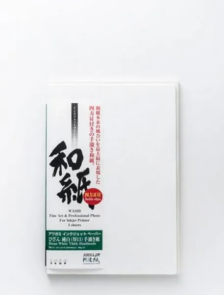 Bizan épais blanc 300 g/m² A2 5f: Le papier BIZAN est fabriqué entièrement à la main avec un procédé traditionnel. Ce papier luxueux a une épaisseur généreuse et ses quatre bords sont frangés. Grâce à sa rigidité, les images imprimées sur ce papier peuvent être exposées sans encadrement.