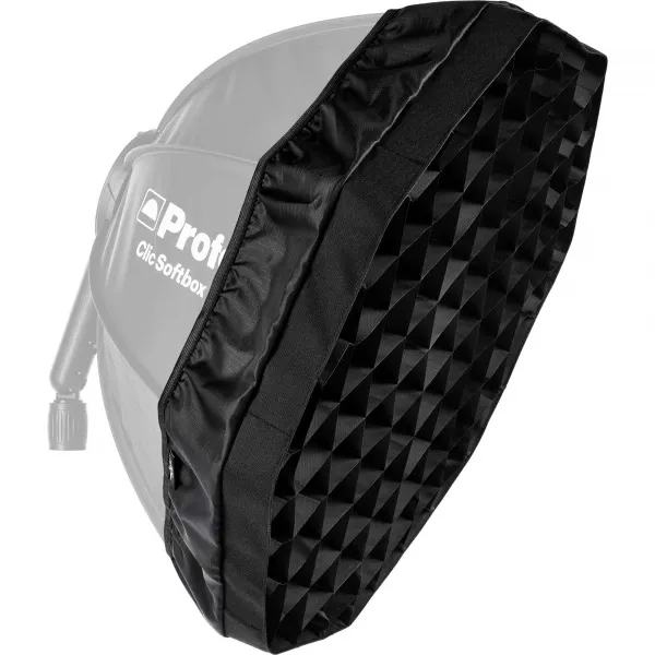 Vous pouvez accrocher un nid d’abeilles optionnel sur votre Clic Softbox pour réduire le faisceau de lumière. Le nid d’abeilles crée une lumière plus dirigée et élimine une grande partie de la lumière périphérique, ce qui vous permet de façonner la lumière avec encore plus de précision.