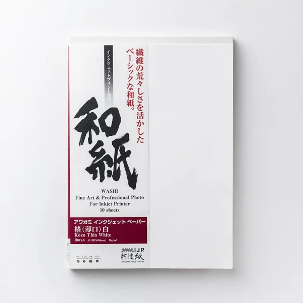 Le papier Awagami Kozo (« mûrier » en japonais) est fabriqué avec des fibres de mûrier de la région de Tokushima, il est connu pour sa résistance et sa durabilité. Ce papier exceptionnel a un aspect souple et solide ce qui permet d’éviter les plis.