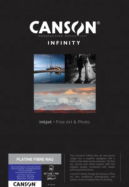 Canson® Infinity Platine Fibre Rag allie les qualités du papier d’art 100% coton proposé par Canson® depuis des années au marché de la photographie argentique et une enduction jet d’encre à la pointe de la technologie. Canson® Infinity Platine Fibre Rag est l’alternative numérique au papier photo baryté traditionnel.
