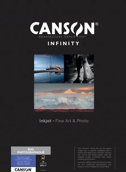 Canson® Infinity Rag Photographique est un papier 100% coton de qualité musée pour l’édition d’art numérique et la photographie. Sa teinte exceptionnellement blanche est obtenue durant la fabrication en ajoutant des minéraux naturels. Ce papier a été conçu pour répondre aux exigences du marché en terme de résistance au vieillissement et de durabilité des impressions.