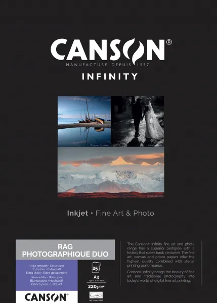 Canson® Infinity Rag Photographique Duo est un papier 100% coton ultra lisse et couché sur les deux faces. Il possède un toucher satiné et sensuel et un blanc d’une pureté exceptionnelle sans l’utilisation d’azurants optiques. Ce papier permet d’obtenir des impressions aux couleurs intenses et aux noirs les plus profonds.