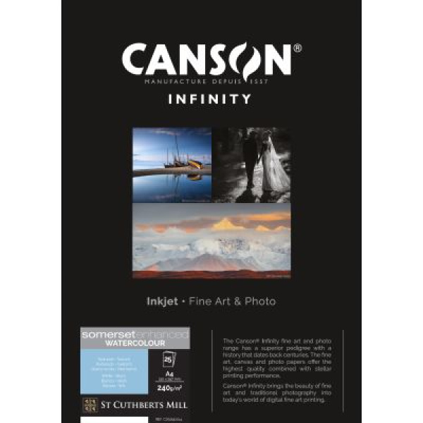 Fabriqué par les artisans papetiers de St Cuthberts Mill en Angleterre, Somerset® Enhanced Watercolour White présente une surface traditionnelle d'aquarelle 'grain fin'. Ce papier 100% coton, fabriqué sur forme ronde et sans azurants optiques, présente une teinte blanc naturel. Le papier est doux au toucher et sa surface texturée offre aux graveurs, aux artistes et aux photographes un aspect pictural à l'impression finale.