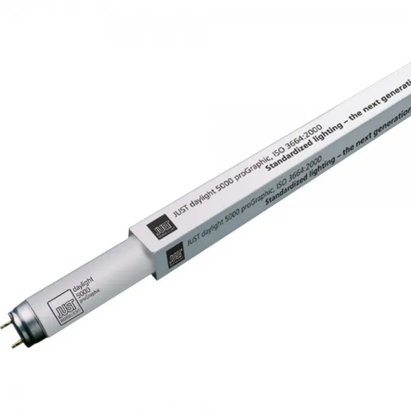 Les lampes fluorescentes D50, spécialement développées pour les travaux de pré-presse et de presse, répondent à la norme ISO 3664:2009 en vigueur qui exige une augmentation de la teneur en UV. Que ce soit pour remplacer une lampe, ou pour passer à la dernière norme ISO, les lampes JUST daylight 5000 proGraphic sont totalement compatibles avec l'ensemble des dispositifs JUST Normlicht.Grâce à leurs propriétés spectrales constantes et la qualité supérieure des couleurs, ces lampes à lumière du jour vous permettent de travailler en toute confiance.